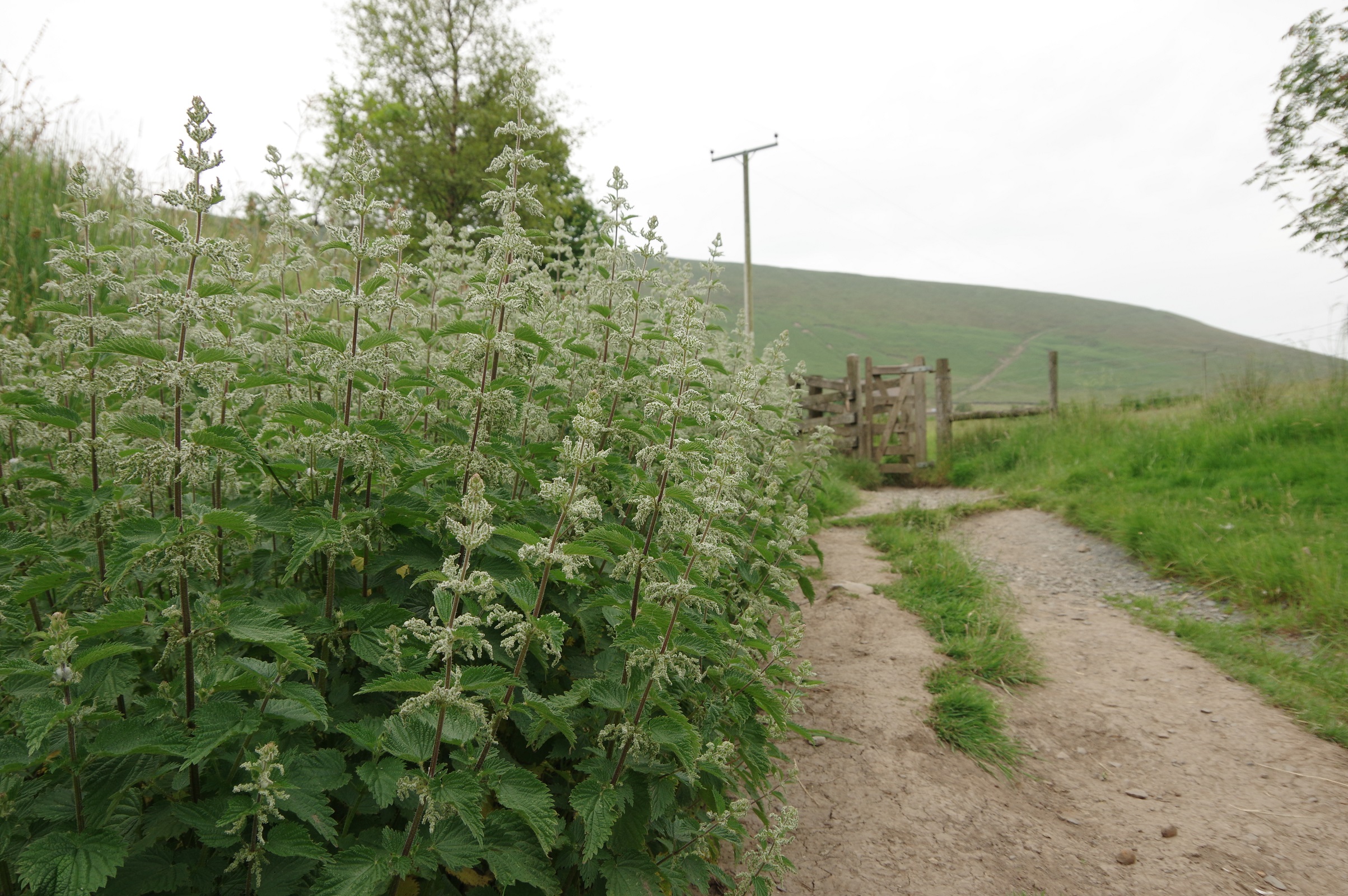 In the middle of a heat wave the outlook is likely to be hazy but with overnight rains I’m hopeful that the air will have cleared and I’ll have a good view back towards Settle Moor and the hills east of Malhamdale. Starting from the cheerful village of Barley I soon pick up the well-signed Pendle Way and begin what becomes before long a relentless ascent. The early stages are marked by appealing encounters with gnarled, hollowed out ash trees, well-kept cottage gardens and I even find a patch of Nettles in full flower attractive. Well, if you ignore the stings it’s quite a pretty plant really – and useful!
