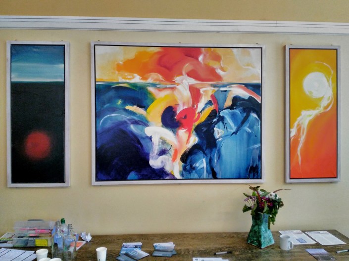 This is where I believe Quaker worship can help. I was reminded of this recently on a visit to the Woodbrooke Study Centre in Birmingham. In the large meeting room a stunning triptych hangs – an abstract by Adam Boulter, Anglican priest, titled ‘Dawn of Creation’. Not knowing that title I might have guessed the general theme but also might have kept guessing: the canvas is alive and fluid with almost tangible forms to which any number of meanings could be attributed. On that visit, during a period of silent worship I became so engrossed in the piece that it seemed to pulse with life. On the left is a darkish column – the sea perhaps – in which the dim image of a red circle floats under a pale sky. In the central, main panel, streaks of red and gold swirl across the ‘sky’ and mingle with the ‘sea’, churning it into a boiling mass of colour. The right-hand panel contains another circle, this time of white and from which strands of light trail across the view against a background of yellow and orange. Not knowing the title my musings on this extraordinary imagery were free to roam. What I saw was a kind of restitution: from stillness to movement; from entrapment to liberty; from despair to joy. And in every such interpretation the central panel was essential – far from moving straight from one state to its opposite, the transformation, wrought by light itself, was the location in which the viewer is poised, just as throughout life every person is in a state of continual transformation. The question of what kind of transformation we aspire to is the one we ask ourselves in the silence of a Quaker meeting; and what we’re seeking in that same space is a transformation of ourselves and society wrought by light.