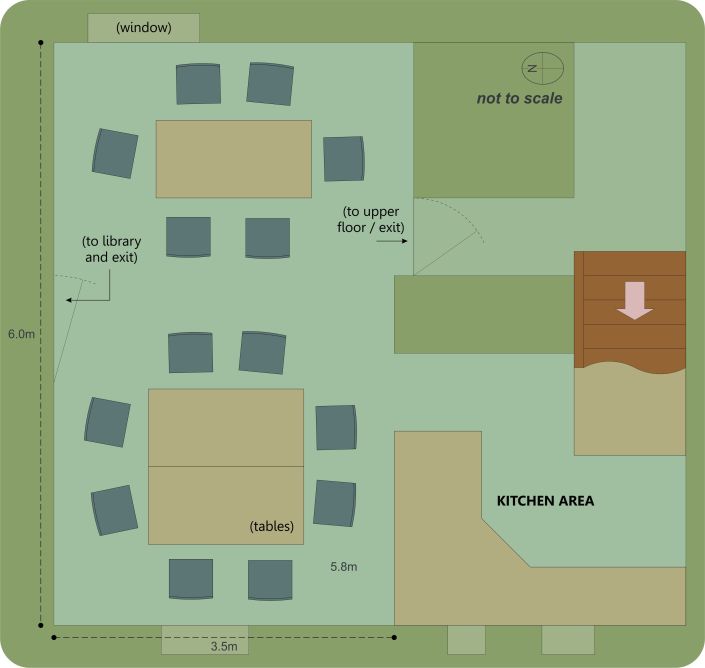 The ground floor of the Barn comprises a meeting space 6×3.5m, with open plan access to a kitchenette and a small library / break out space adjacent. Doors on both sides lead to lobby / entrances and access to the grounds. The plans here give an indication of possible layouts and typical uses. It’s also used for meetings, discussion groups and as a dining area.