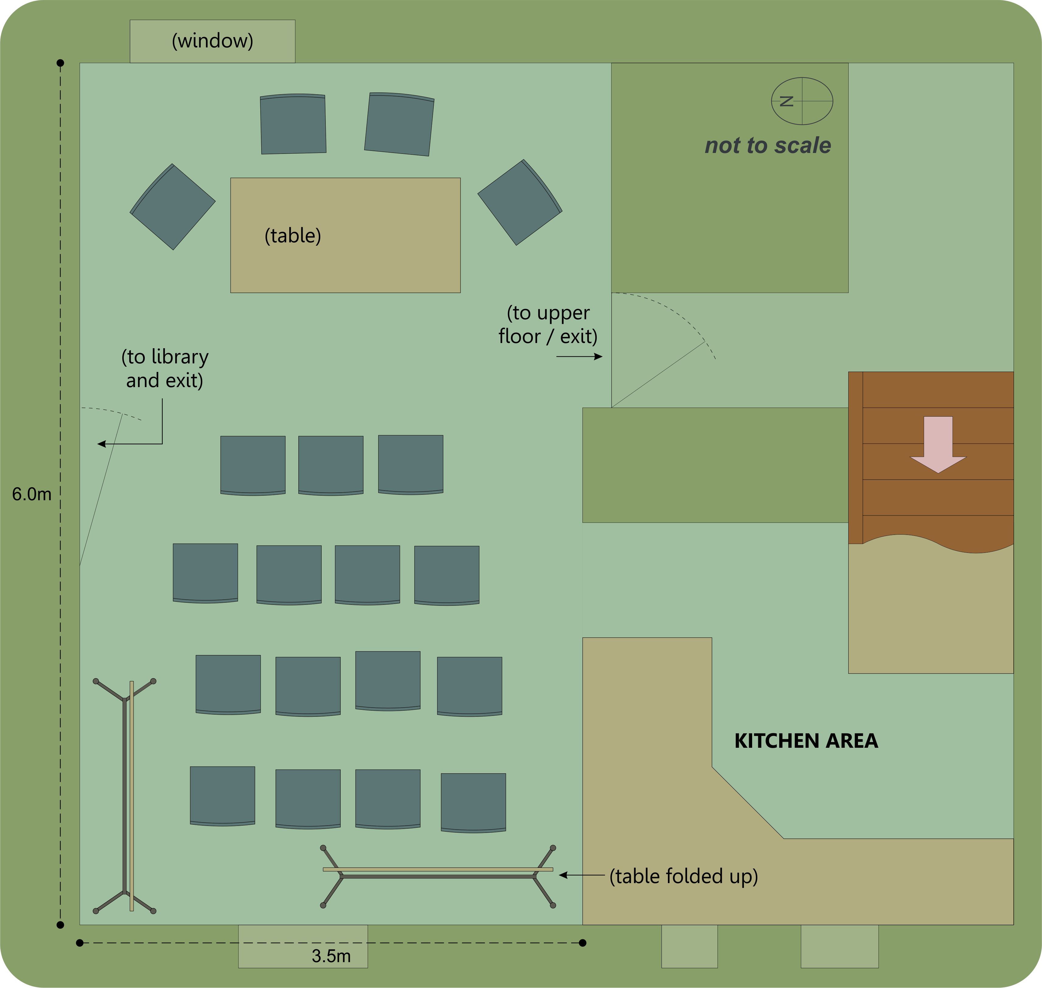 The ground floor of the Barn comprises a meeting space 6×3.5m, with open plan access to a kitchenette and a small library / break out space adjacent. Doors on both sides lead to lobby / entrances and access to the grounds. The plans here give an indication of possible layouts and typical uses. It’s also used for meetings, discussion groups and as a dining area.